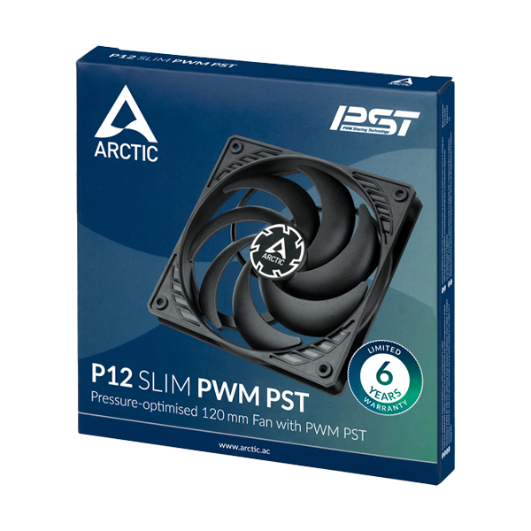 With a wide speed range and innovative PWM Sharing Technology (PST), the P12 Slim PWM PST?s fan speed can be controlled in sync with other fans. ARCTIC?s PST fans come equipped with their own built-in daisy-chain solution, and, in addition to the plug-in connector, have another socket to which an additional fan or up to four other PST fans can be connected in series.
